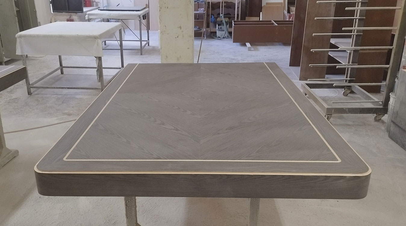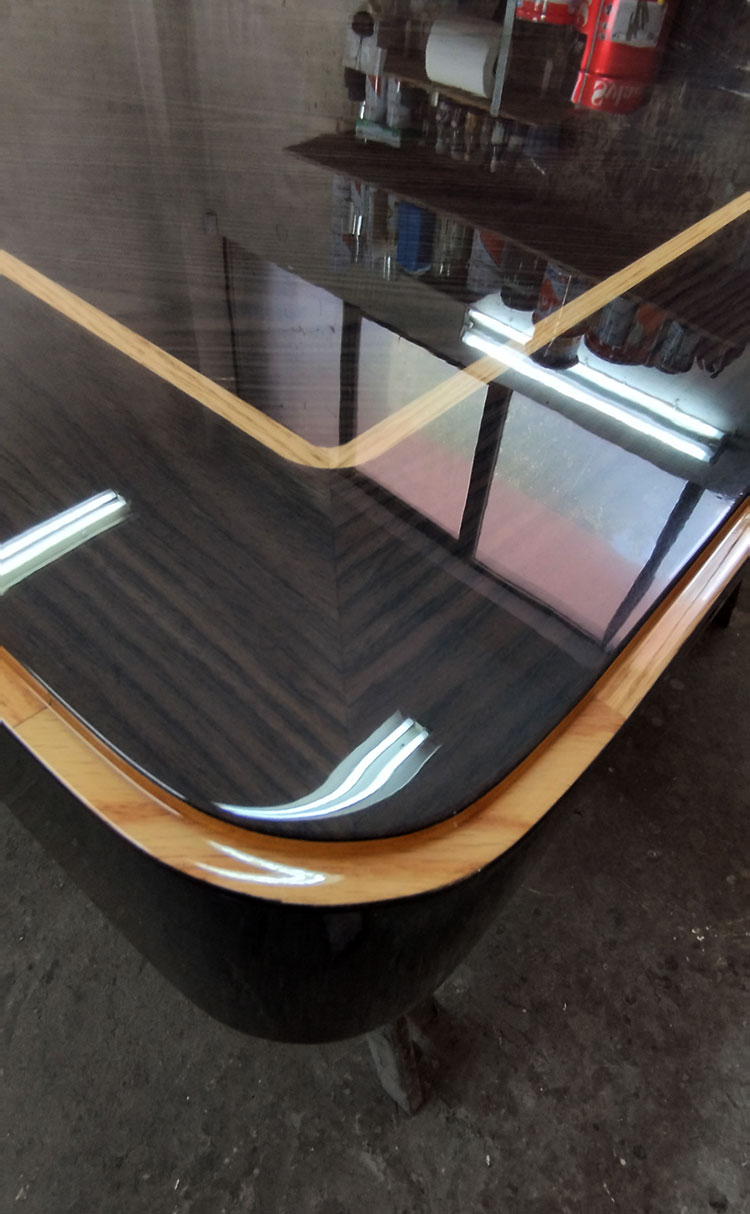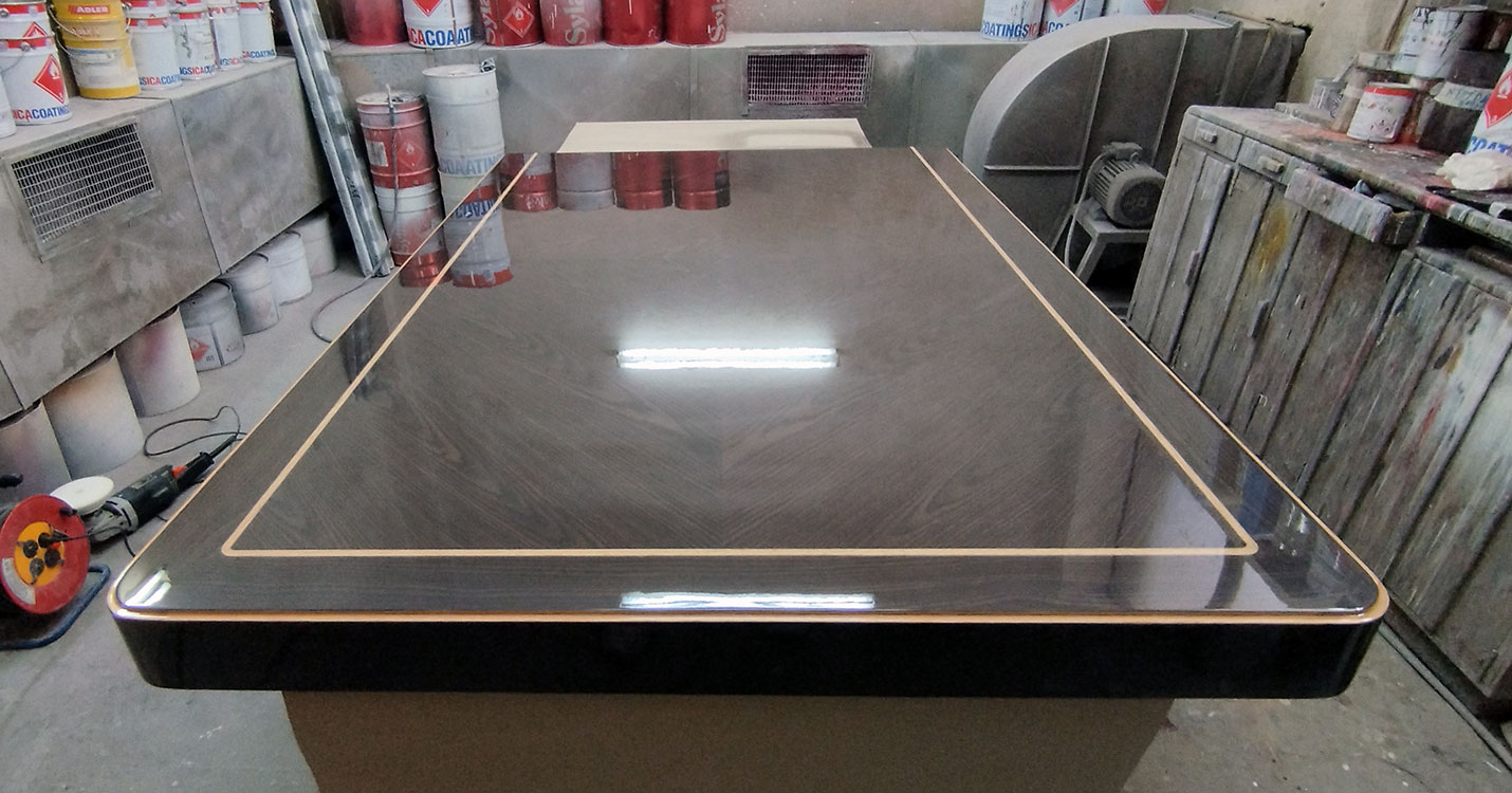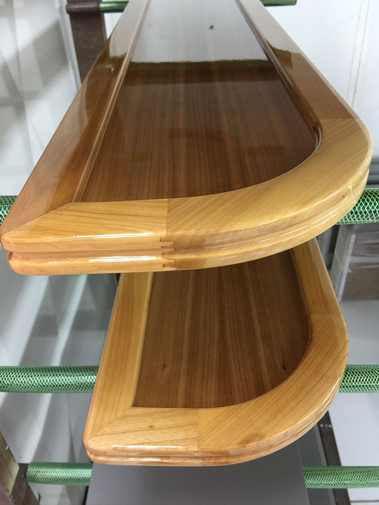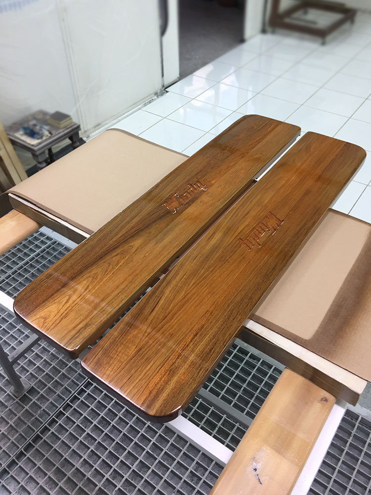 Η επιφάνεια αρχικά τρίβεται,στοκάρεται και στη συνέχεια λουστράρεται. Εφαρμόζεται ειδικό βερνίκι marine και λάδι προστασίας με άριστη διεισδυτικότητα που προστατεύει το ξύλο και αυξάνει την ανθεκτικότητά του.