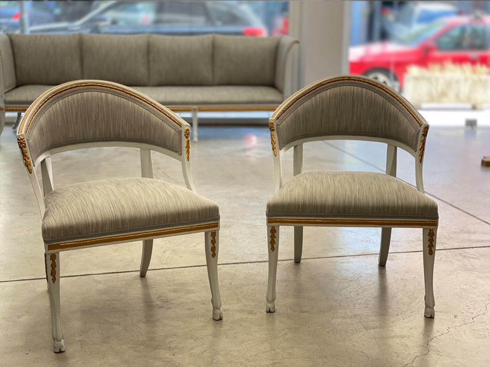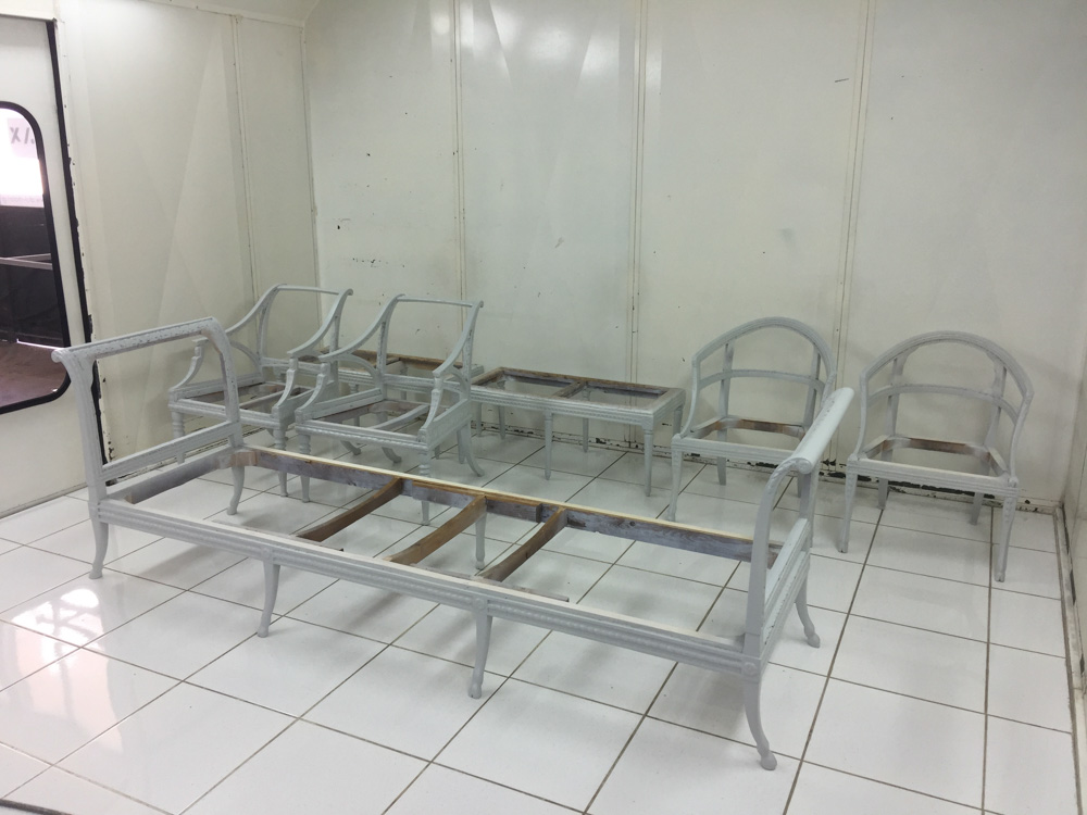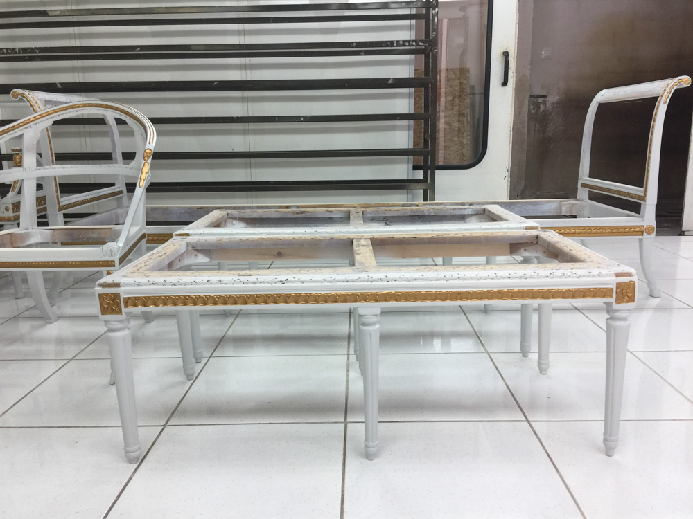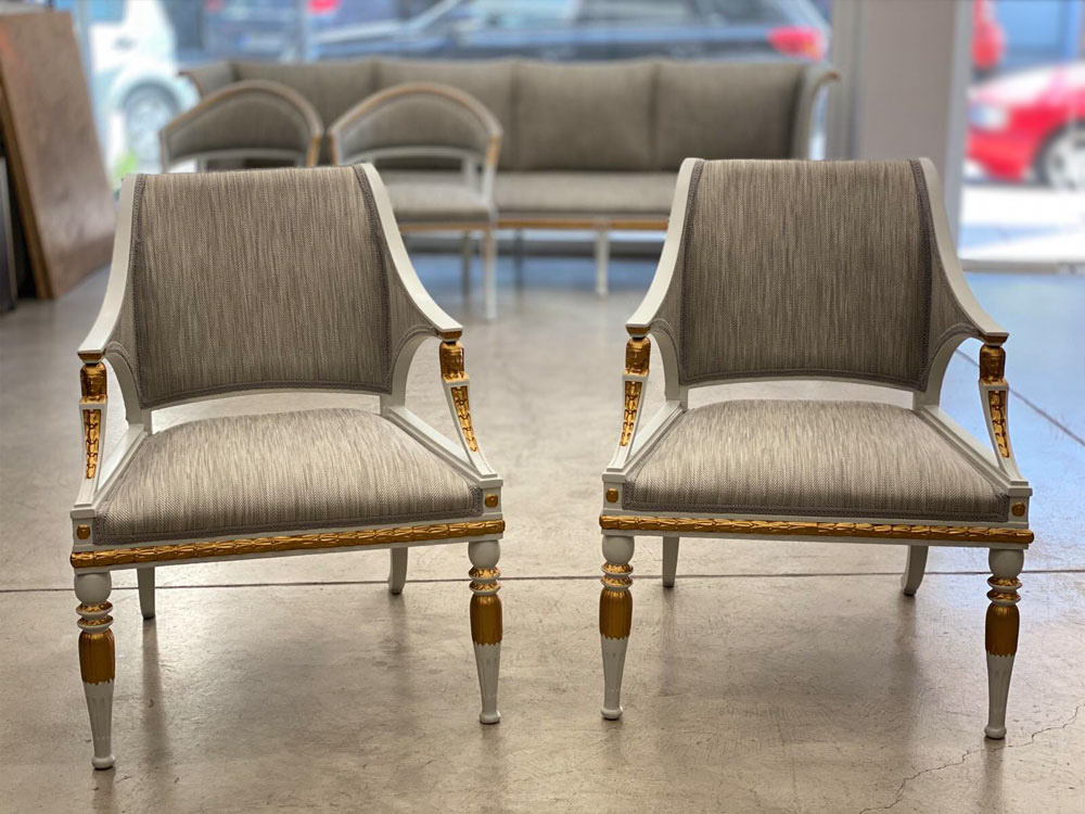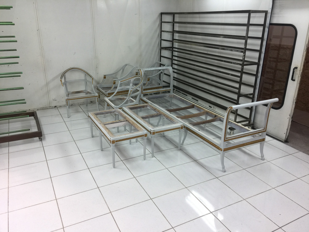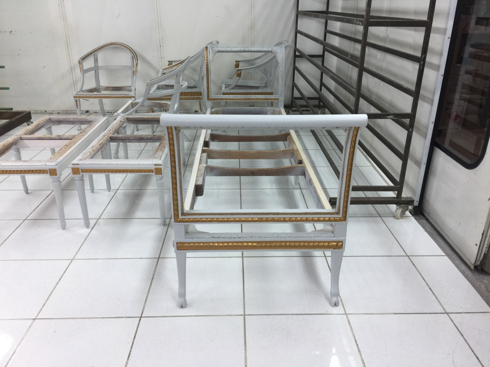 Αναπαλαίωση επίπλων πρεσβείας: καρεκλοπολυθρόνες, ντιβάνι, ταμπουρέ. Αποκατάσταση φθορών και βαφή σε λάκα RAL (χρώμα επιλογής του πελάτη) με λεπτομέρειες χρυσού χρώματος.
