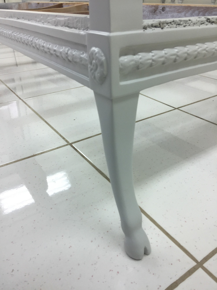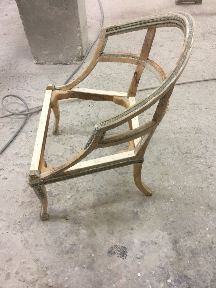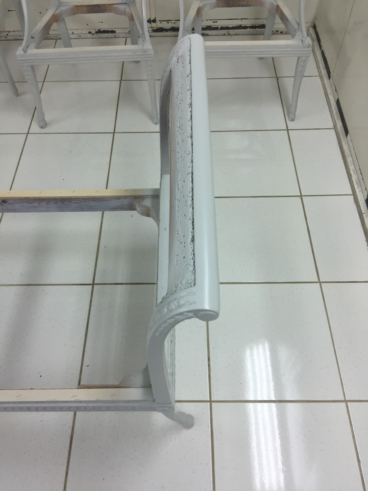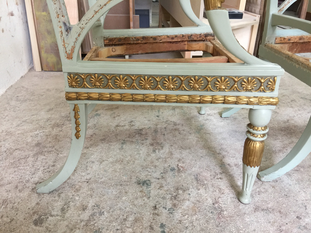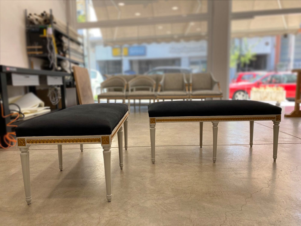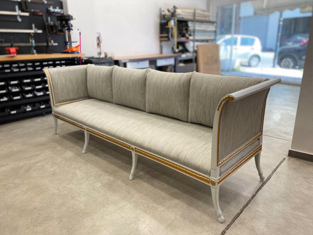 Αναπαλαίωση επίπλων πρεσβείας: καρεκλοπολυθρόνες, ντιβάνι, ταμπουρέ. Αποκατάσταση φθορών και βαφή σε λάκα RAL (χρώμα επιλογής του πελάτη) με λεπτομέρειες χρυσού χρώματος.