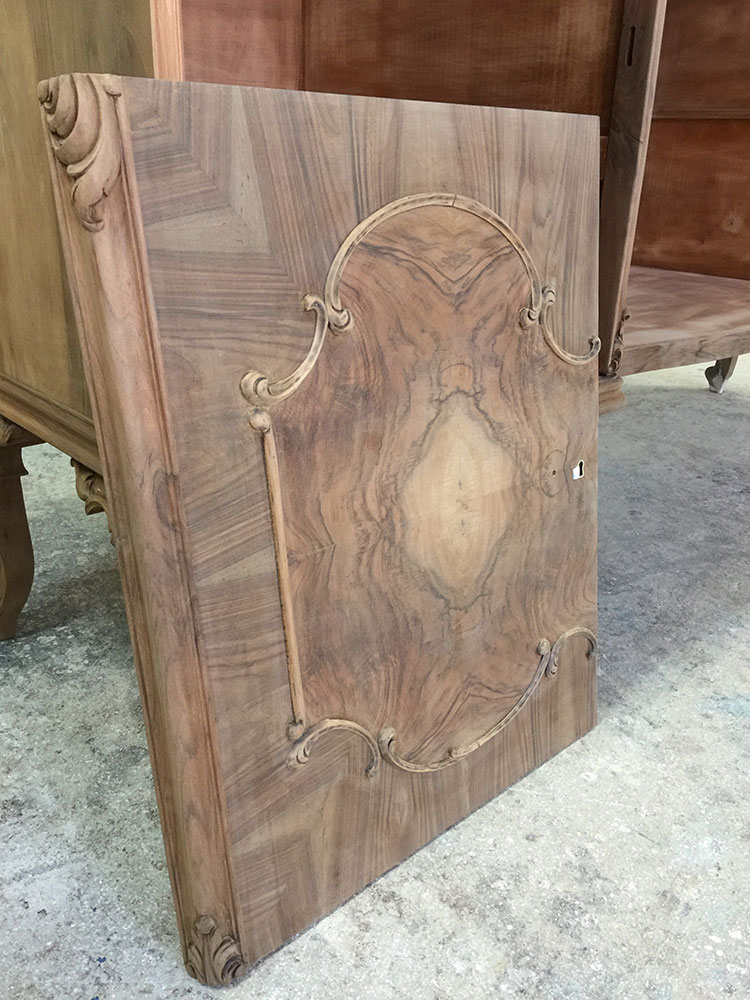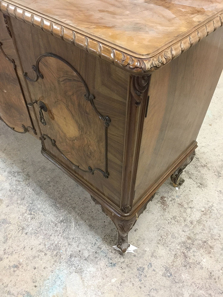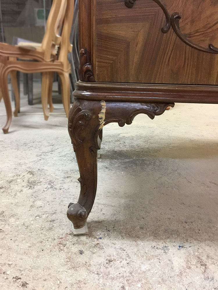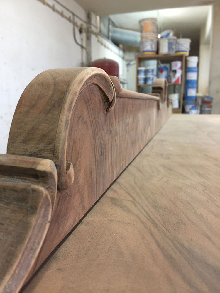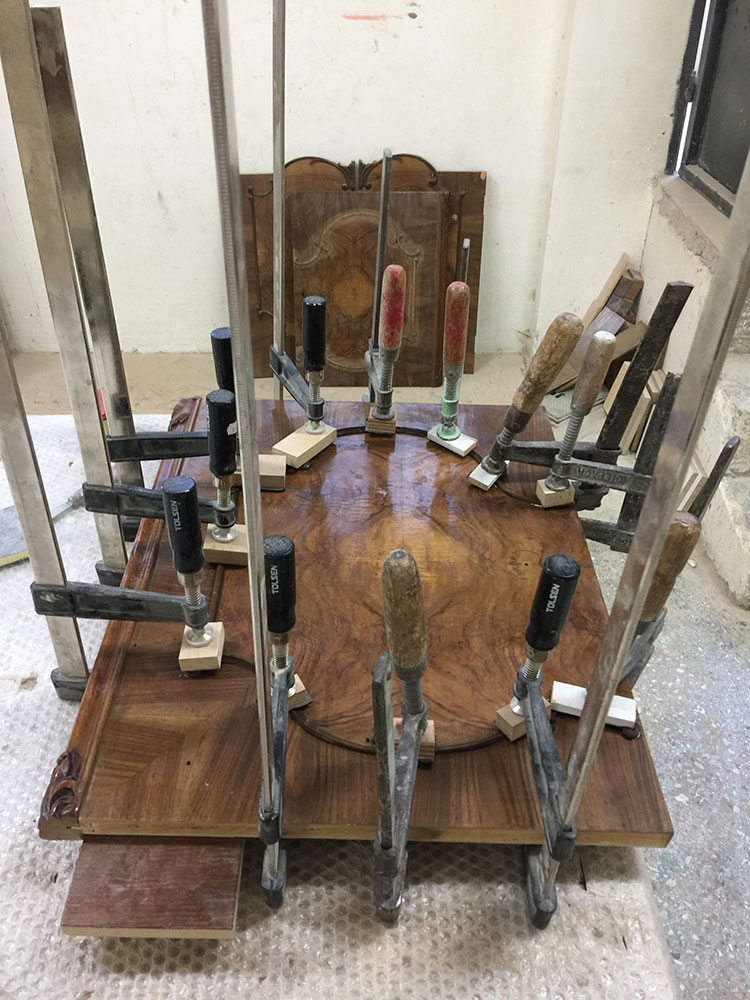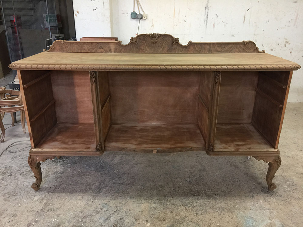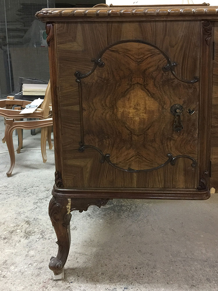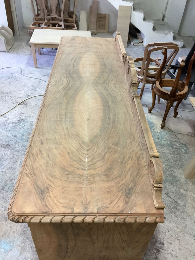Τα έπιπλα κατά την αναπαλαίωση αρχικά τρίβονται, ώστε να απομακρυνθεί το παλιό βερνίκι και επιδιορθώνονται τυχόν φθορές. Έγινε, επίσης, αποκατασταση μπορντουρας στα πορτάκια του μπουφέ.