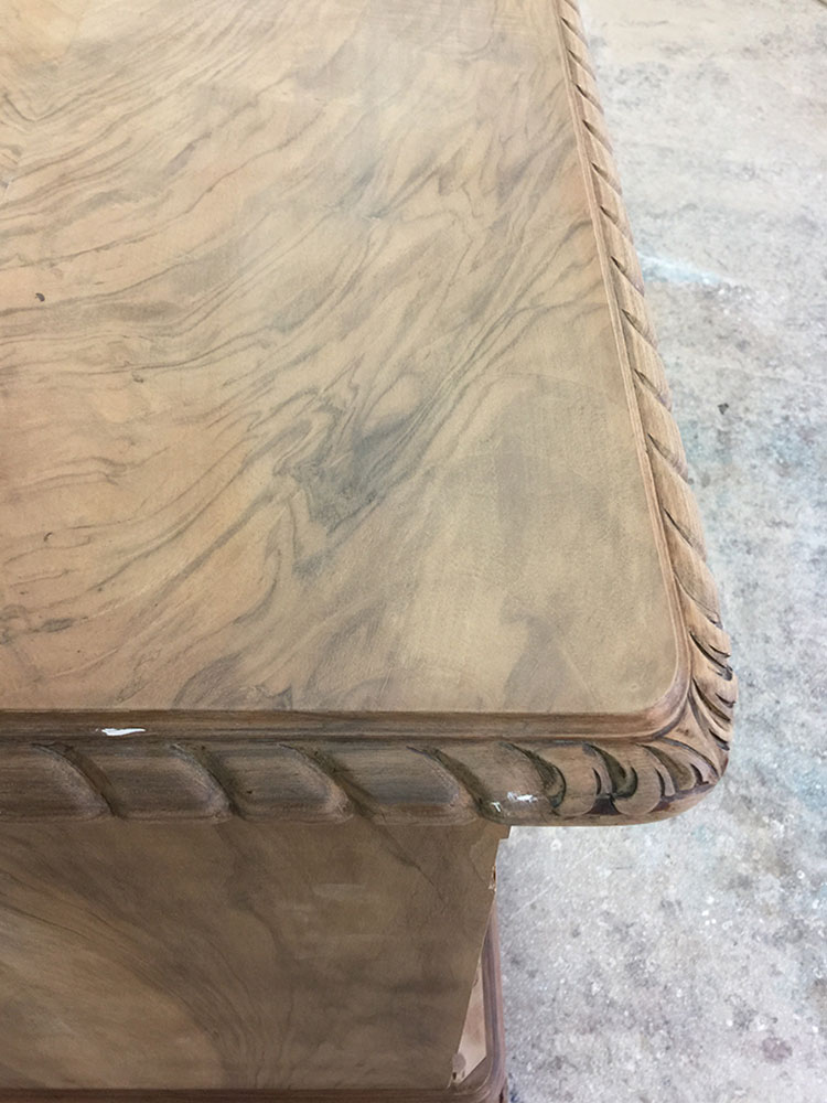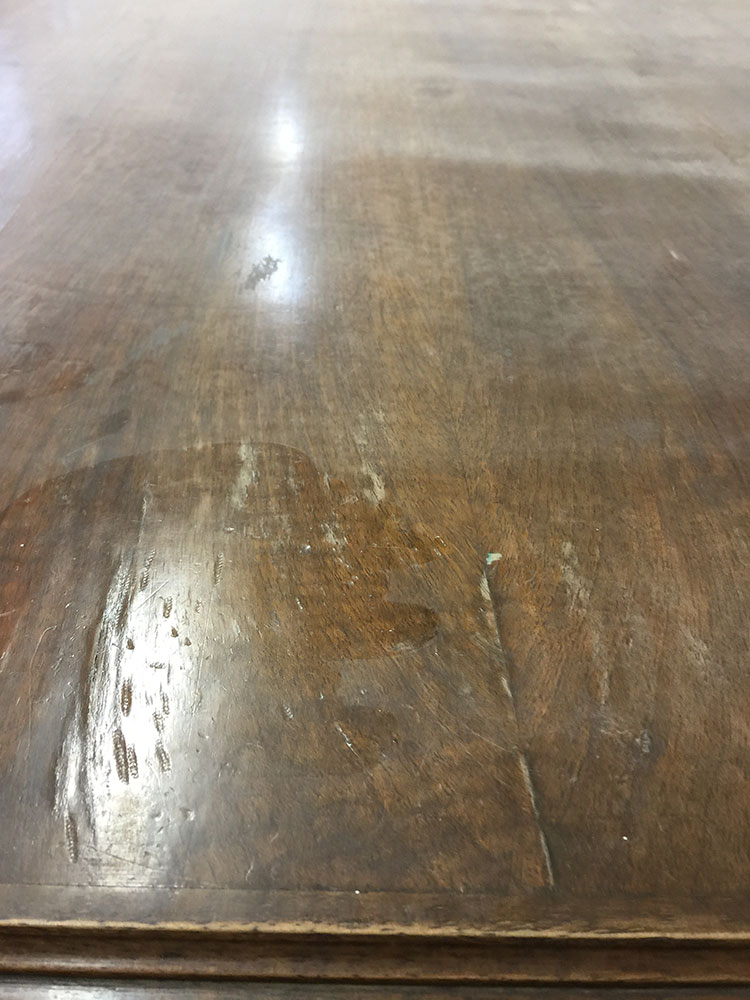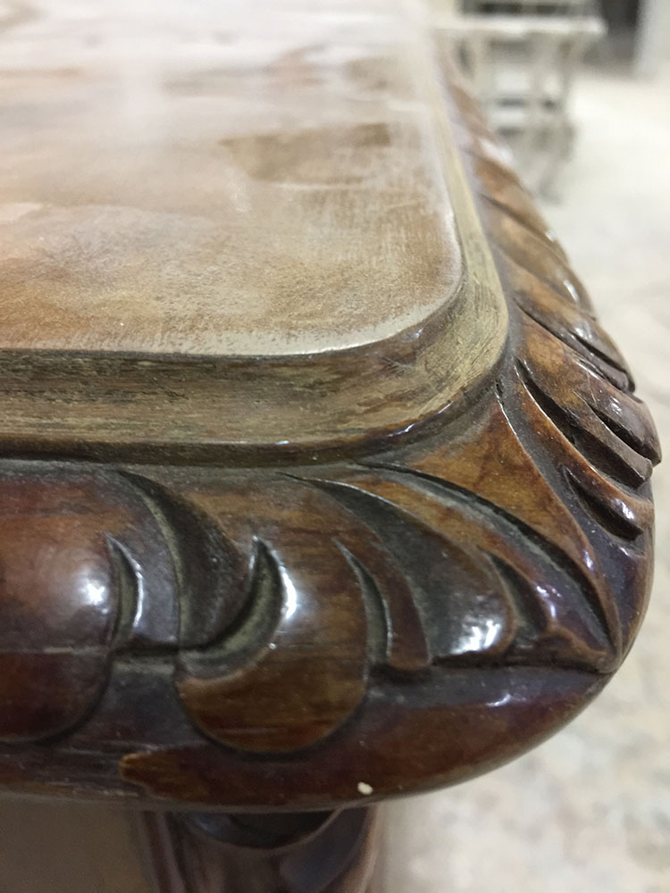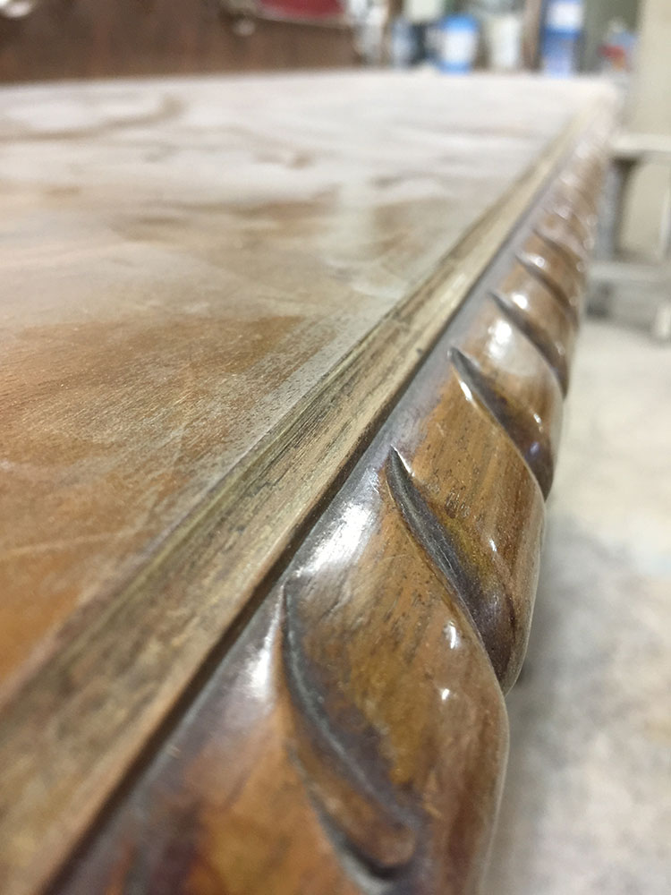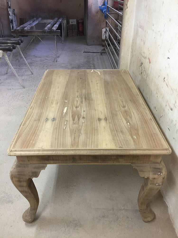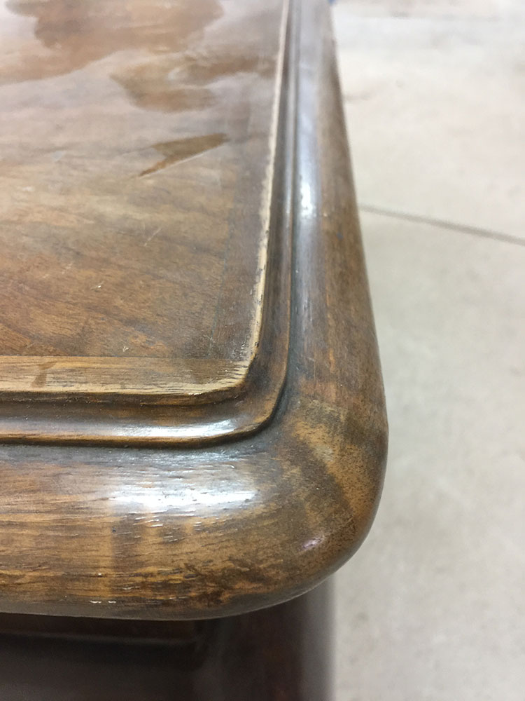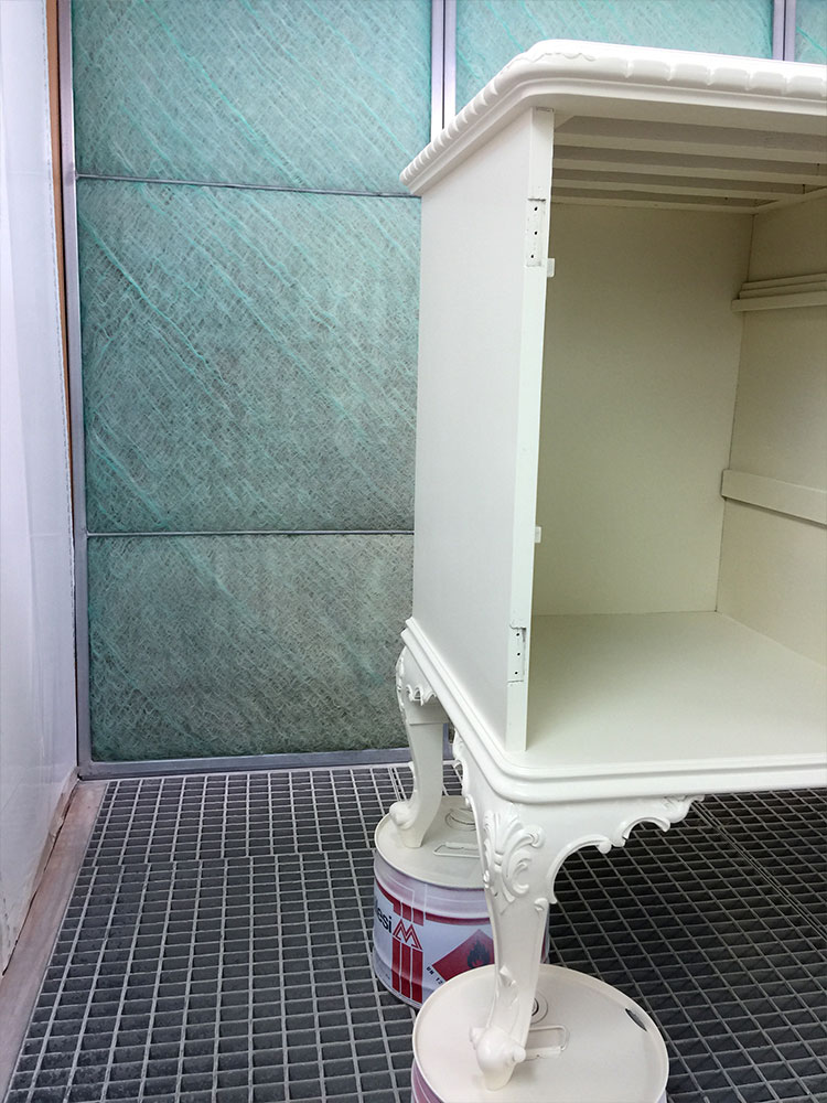 Τα έπιπλα κατά την αναπαλαίωση αρχικά τρίβονται, ώστε να απομακρυνθεί το παλιό βερνίκι και επιδιορθώνονται τυχόν φθορές. Έγινε, επίσης, αποκατασταση μπορντουρας στα πορτάκια του μπουφέ.