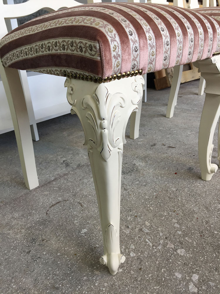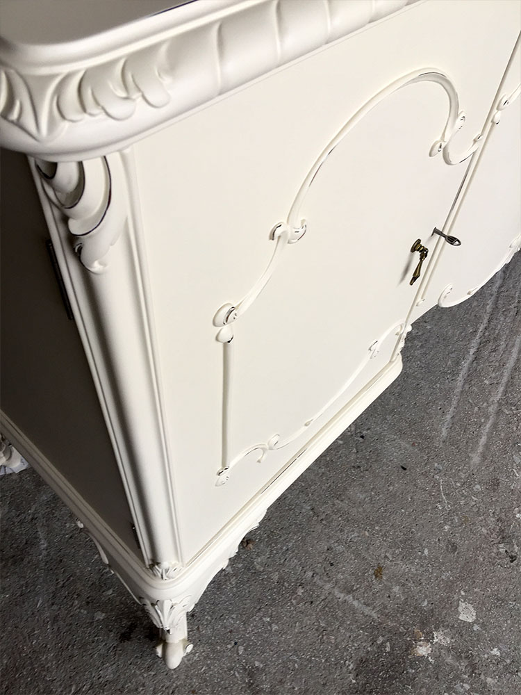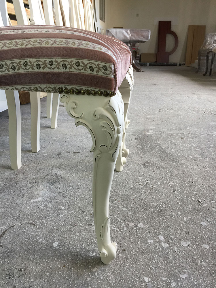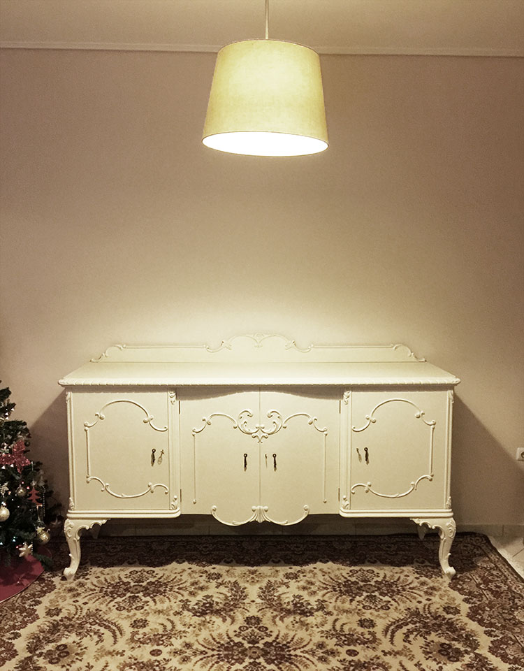 Αναπαλαίωση επίπλων μπουφέ, σετ τραπεζαρίας (τραπεζι και καρέκλες). Αποκατάσταση φθορών και βαφή σε λάκα χρώματος επιλογής του πελάτη με λεπτομέρειες γαλλικής πατίνας.