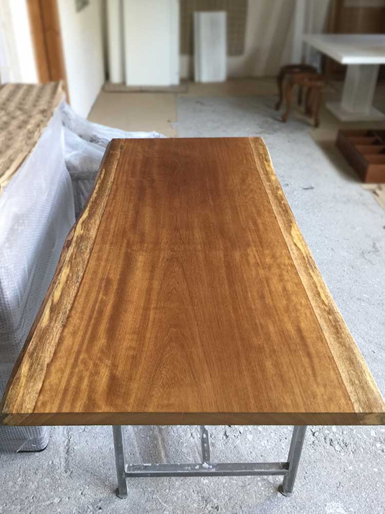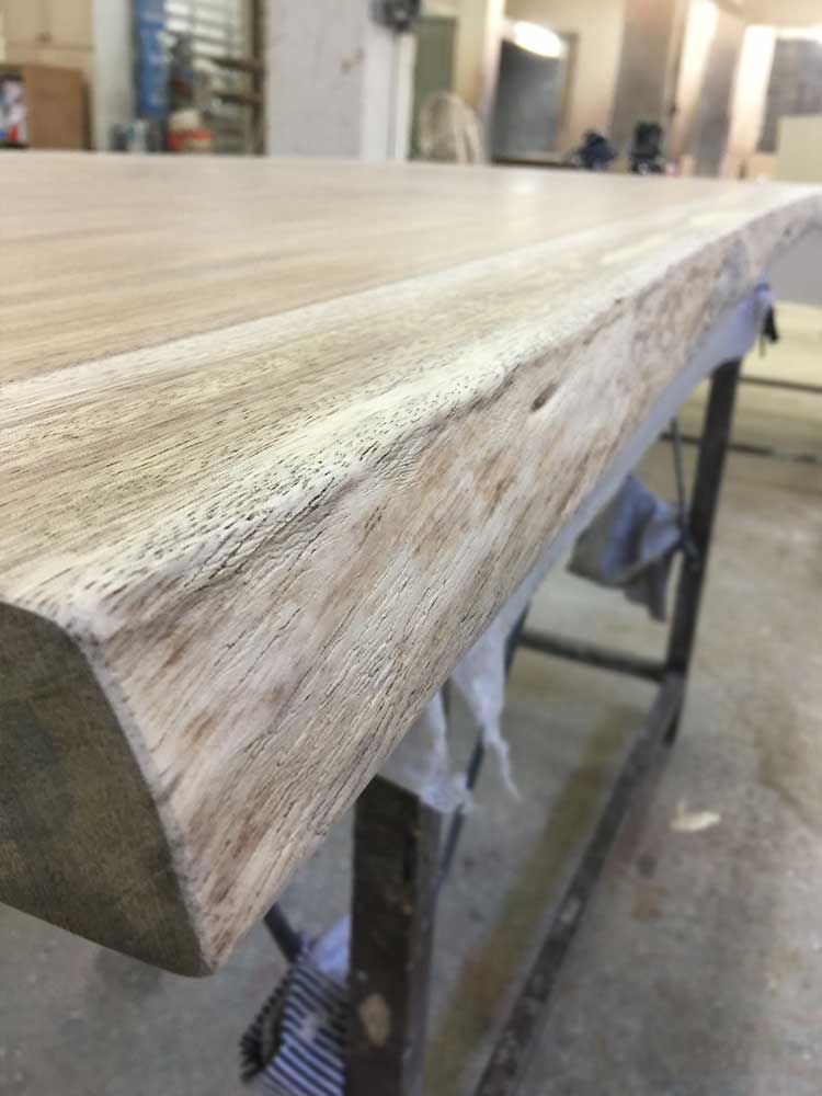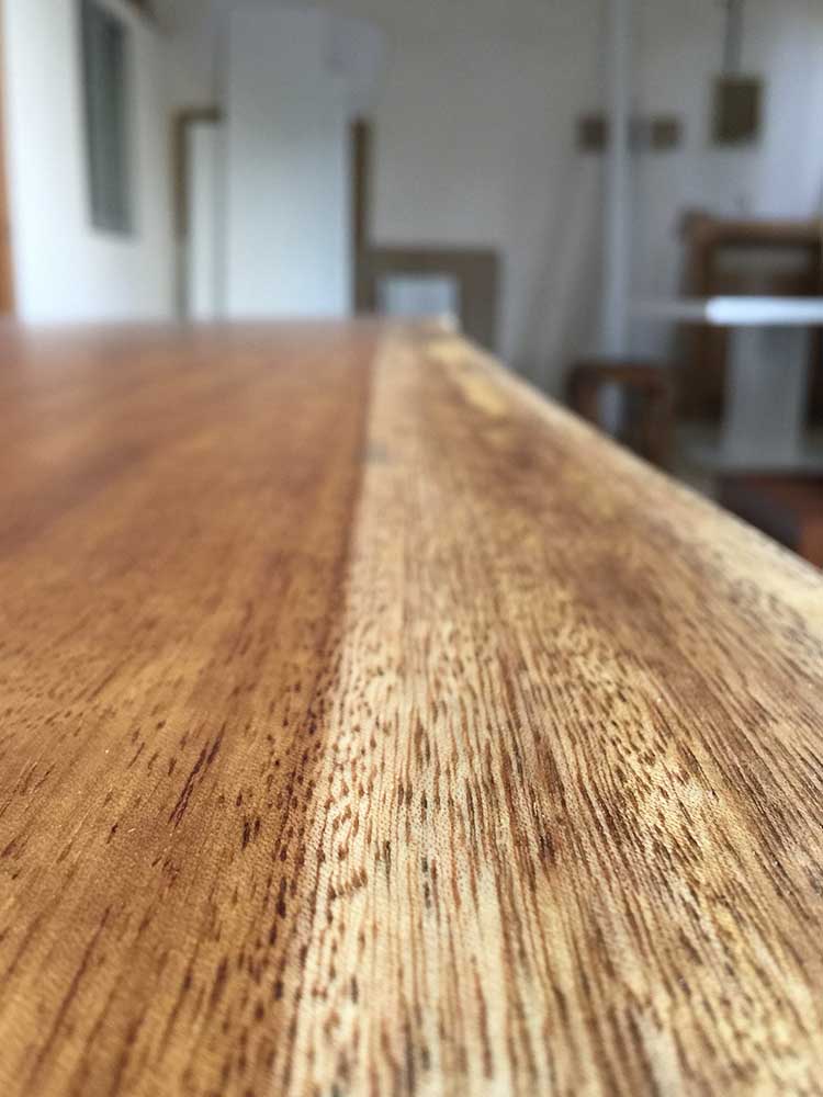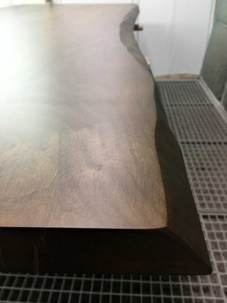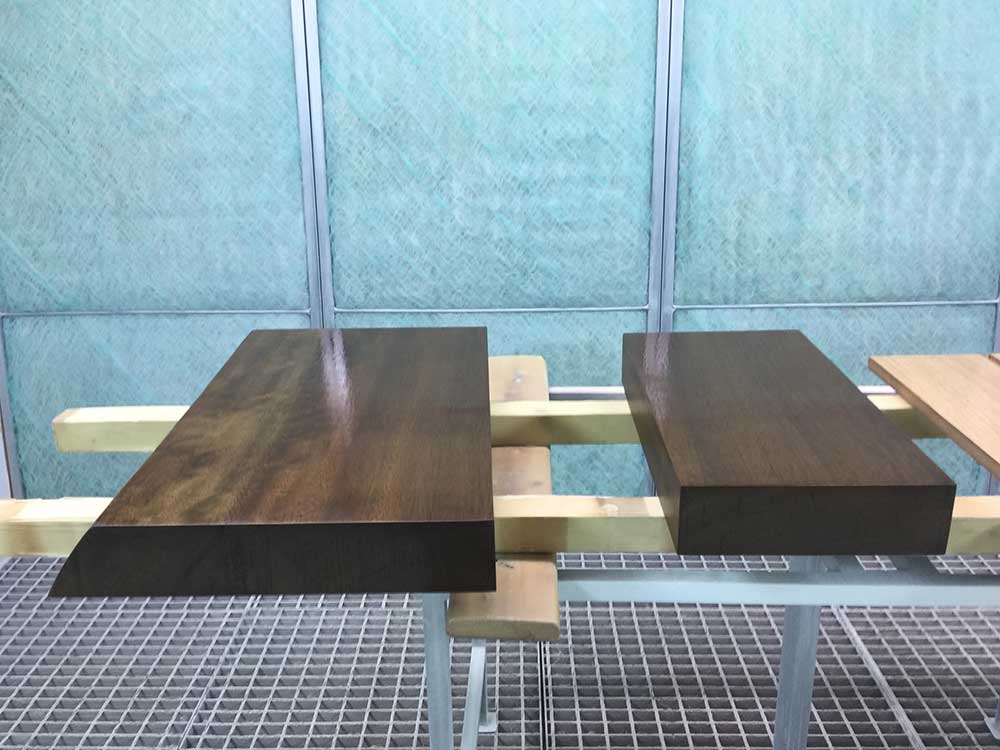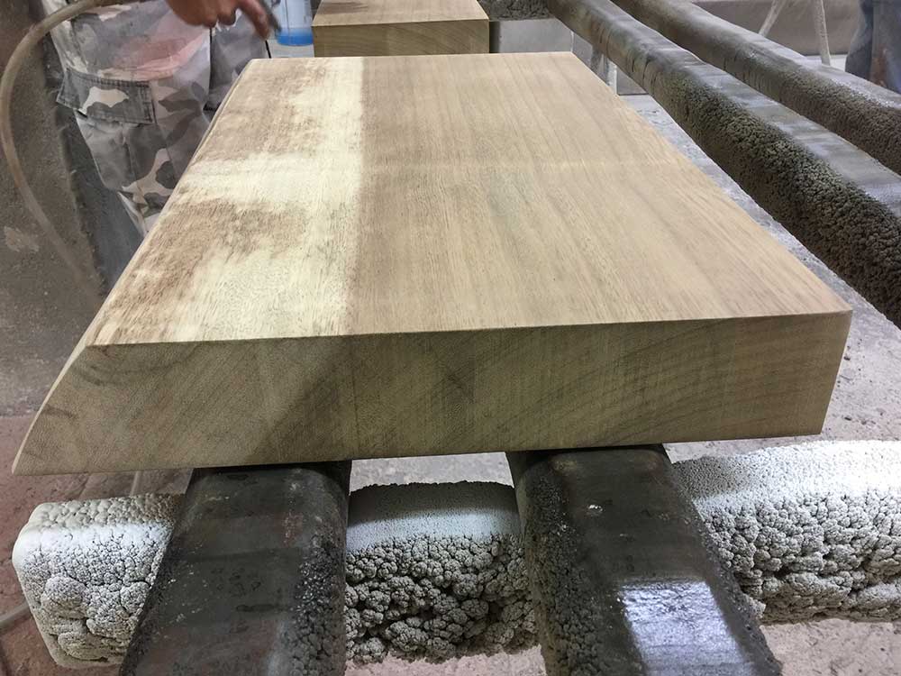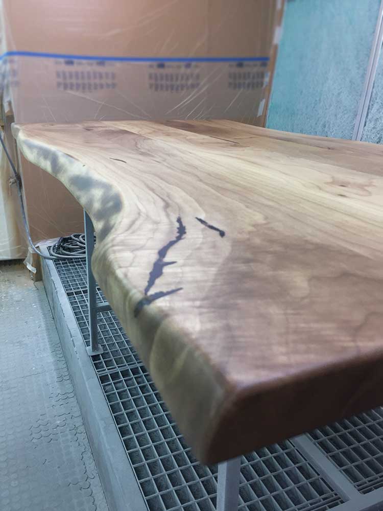 Βαφή λούστρο με ακρυλικό βερνίκι διάφανο ματ σε μασίφ επιφάνειες καρυδιάς, ιρόκο και ακακίας και βαφή λούστρο με ακρυλικό βερνίκι ματ χρώμα επιλογής πελάτη σε μασίφ επιφάνεια δρυός ρουστίκ.
