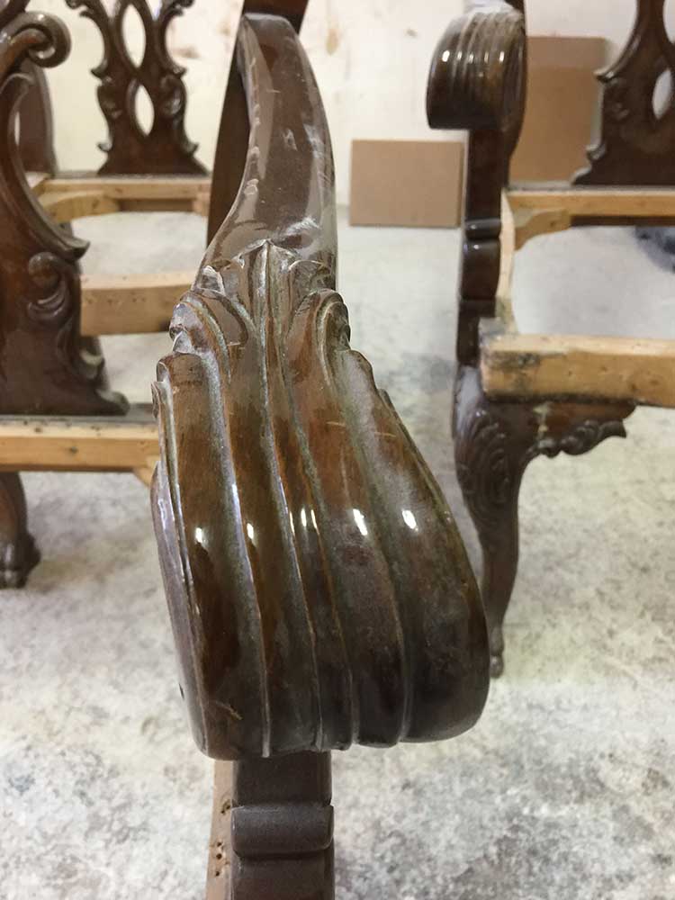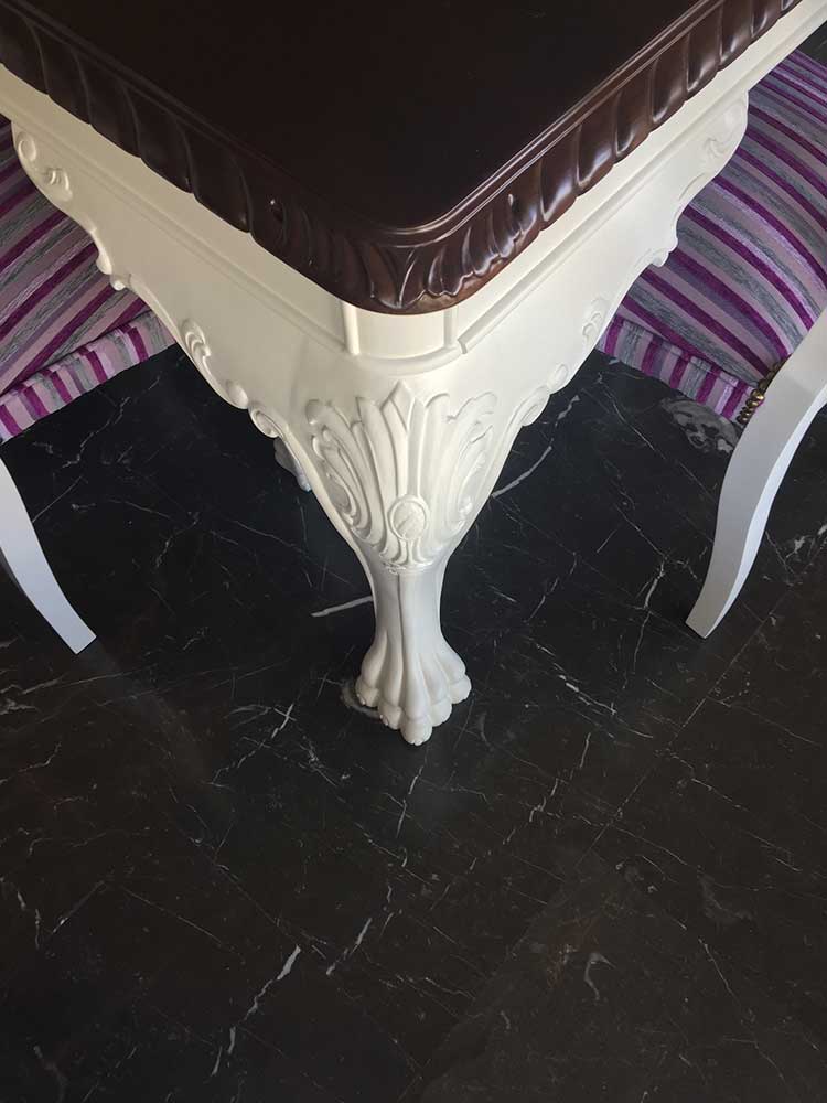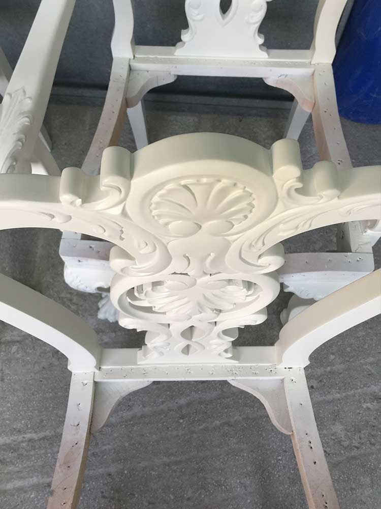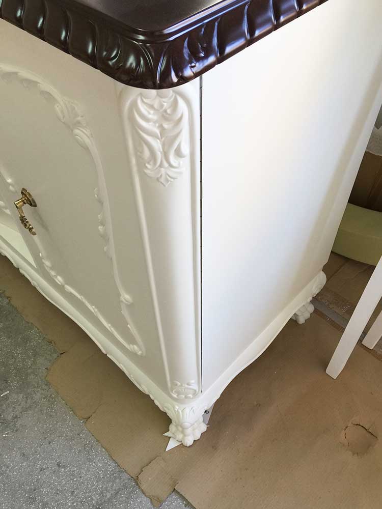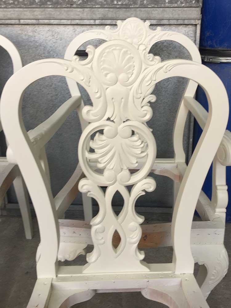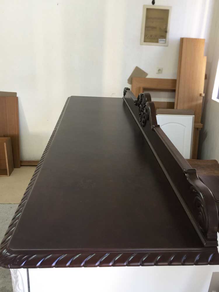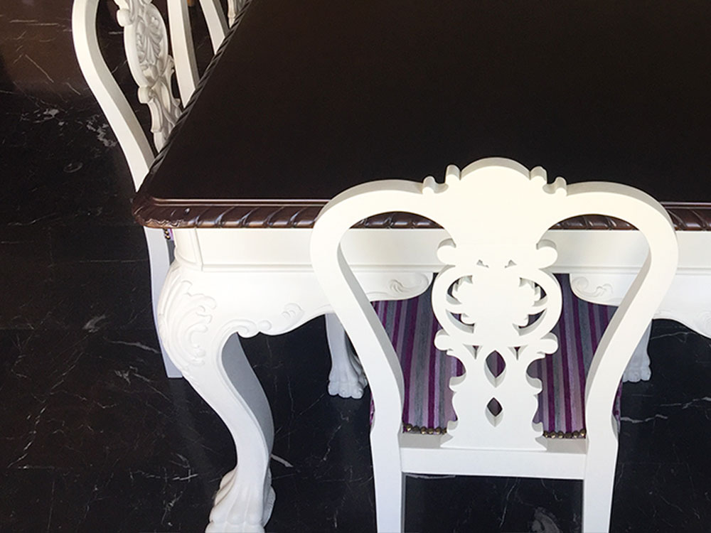 Αναπαλαίωση σε ξύλινες καρέκλες τραπέζαρία και μπουφέ: βαφή λάκας σε χρώμα επιλογής πελάτη και βαφή με λούστρο σατινέ στο καπάκι μπουφέ και τραπεζαρίας